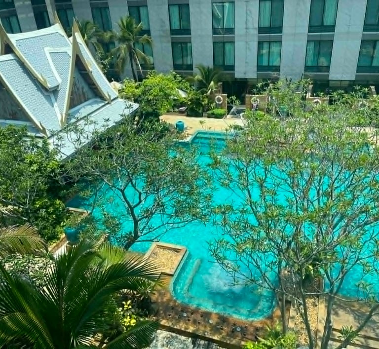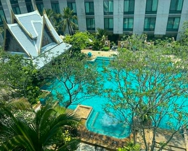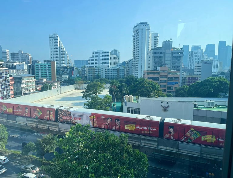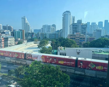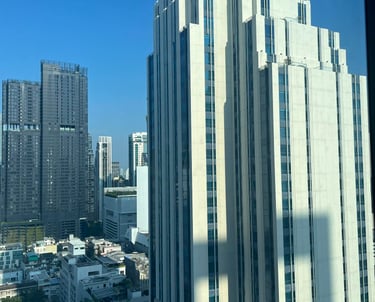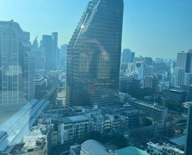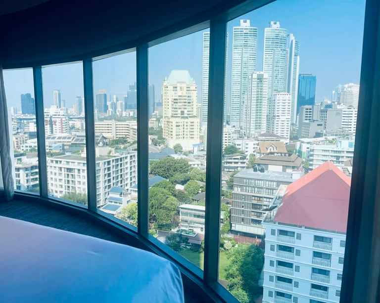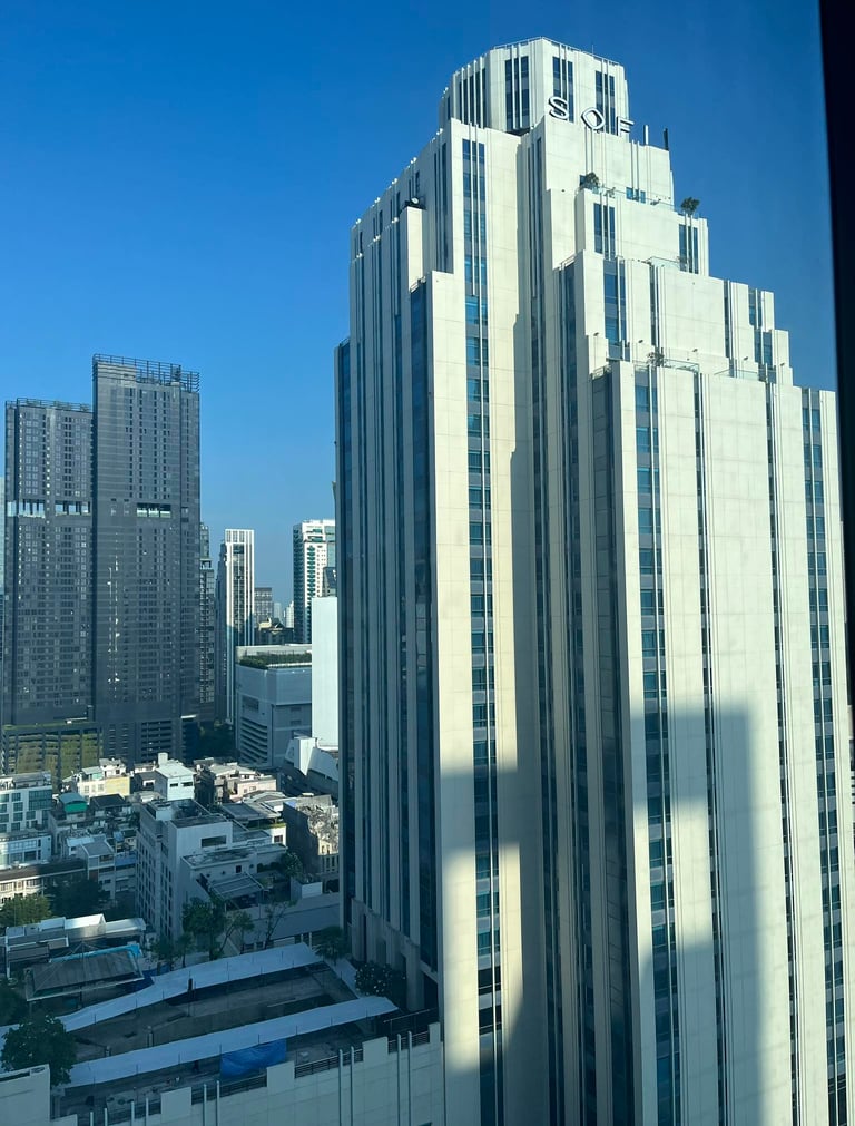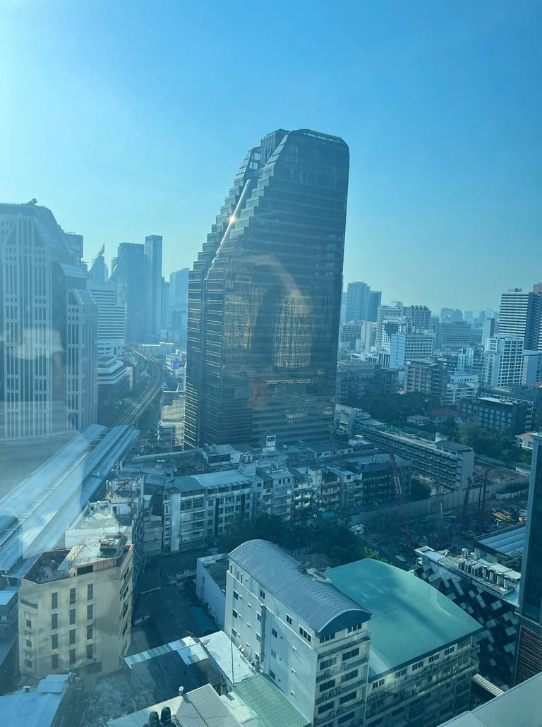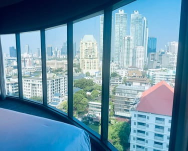 Songkran weekend — the streets full of water and noise and people who'd waited all year for exactly this kind of release. And I was here, somewhere high above the city, watching the skyline in the morning light, eating khao chae for the very first time.