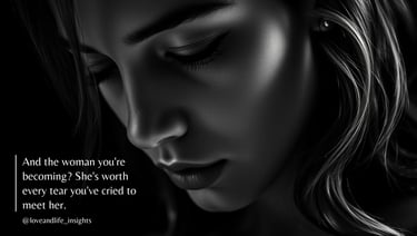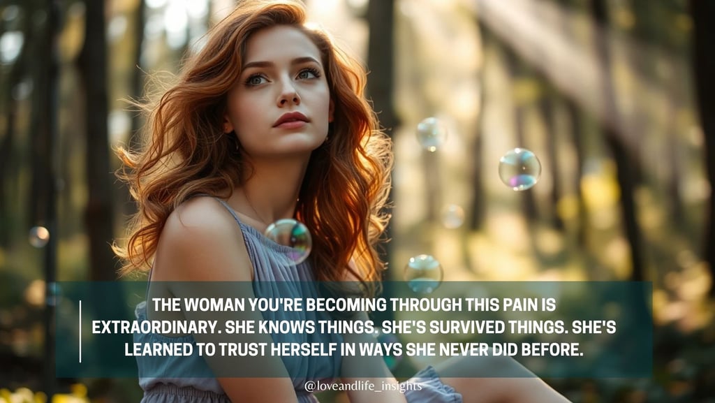 But I promise you this: the woman you're becoming through this pain is extraordinary. She knows things. She's survived things. She's learned to trust herself in ways she never did before. She values connection differently, loves more wisely, and knows exactly what she won't tolerate again.