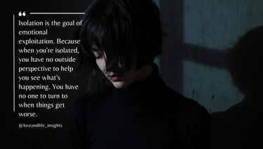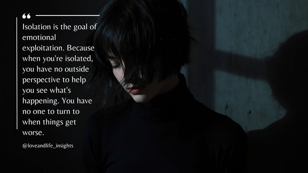 What this reveals: Isolation is the goal of emotional exploitation. Because when you're isolated, you have no outside perspective to help you see what's happening. You have no one to turn to when things get worse.
