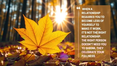 What this reveals: When a relationship requires you to become less of yourself to make it work, it's not the right relationship. The right person doesn't need you to shrink. They celebrate your fullness.